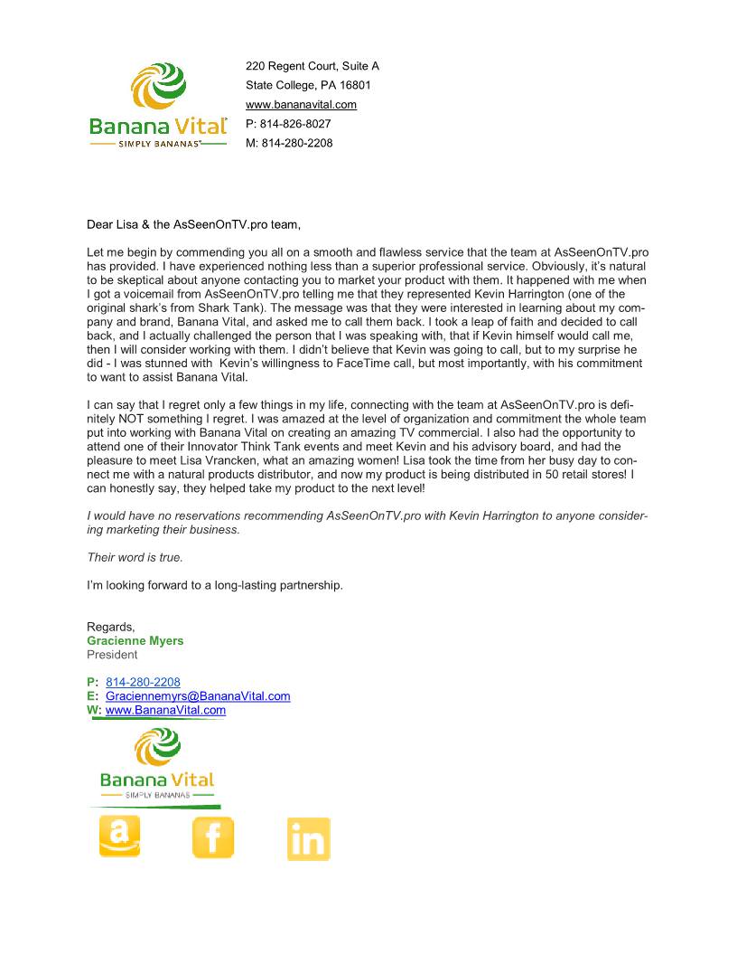 Aside from the television exposure, we integrate a comprehensive marketing campaign utilizing press releases/press wires, social media platforms, relevant blogs and promotions on our AsSeenOnTV.Pro website. For example, our press releases can generate 500+ impressions combined with 1,000+ Social Media Impressions and 1,000+ YouTube Impressions. Kevin Harrington currently has thousands of followers on Facebook, as well as on other social media sites. Kevin’s “reach” figures have averaged over 20,000 organic impressions (without boosts or promos) and peaks above 100,000 with a combination of boosted and organic posts. While we anticipate continued growth of the numbers, it is difficult to accurately measure the entirety of all projected impressions that can be obtained, especially if you continue to repurpose and rebroadcast the spot for additional exposure. The integrated strategies we have implemented throughout the various social media platforms (Instagram, Facebook, LinkedIn, Twitter, etc…) suggest conservative and consistent growth; furthermore, the participant of our TV campaign is encouraged to collaborate with our social media team in order to maximize the potential of these campaigns.